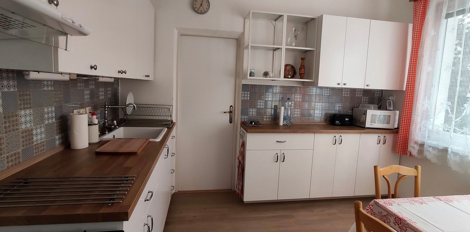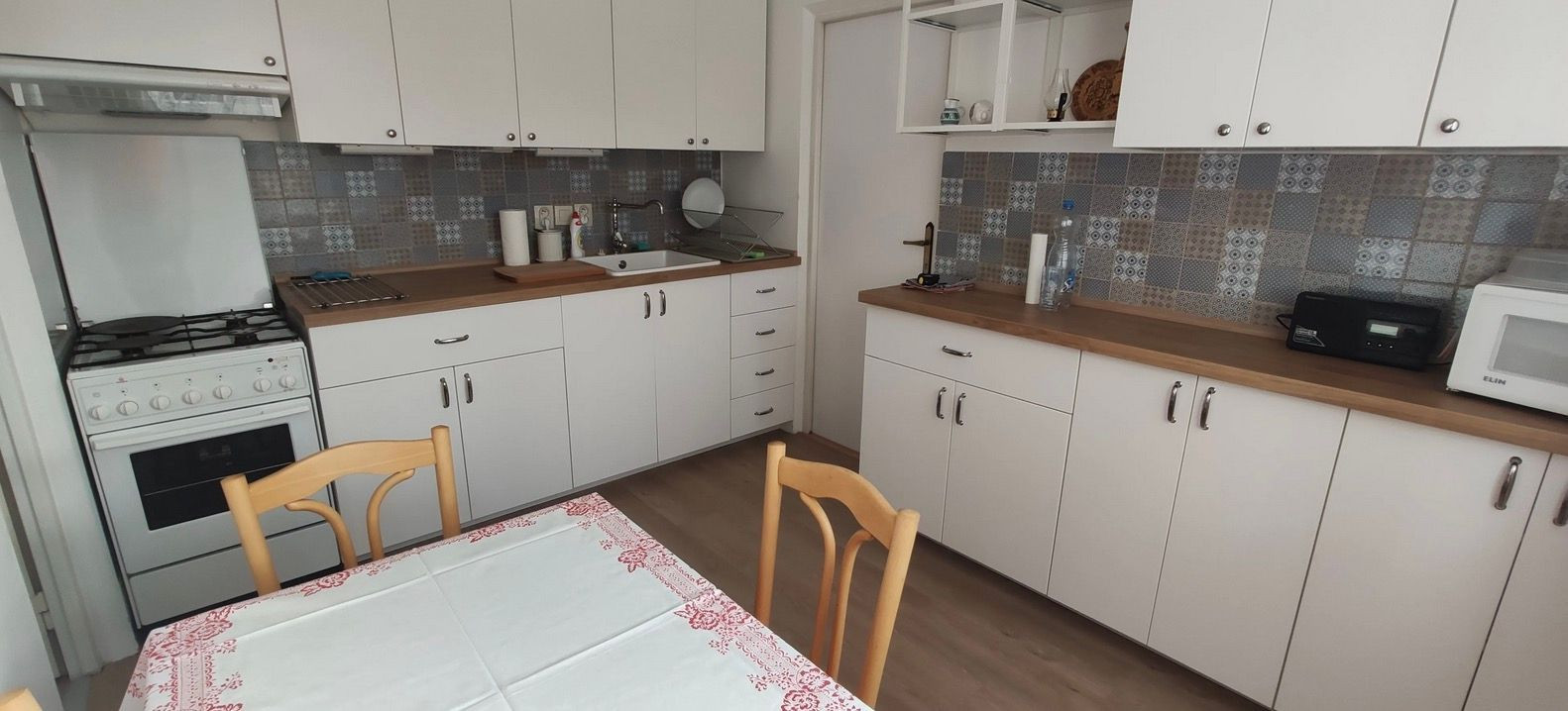 - kuchyňa s jedálenským stolom, plynovým sporákom s el. trúbou a kuchynskou linkou