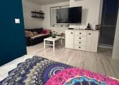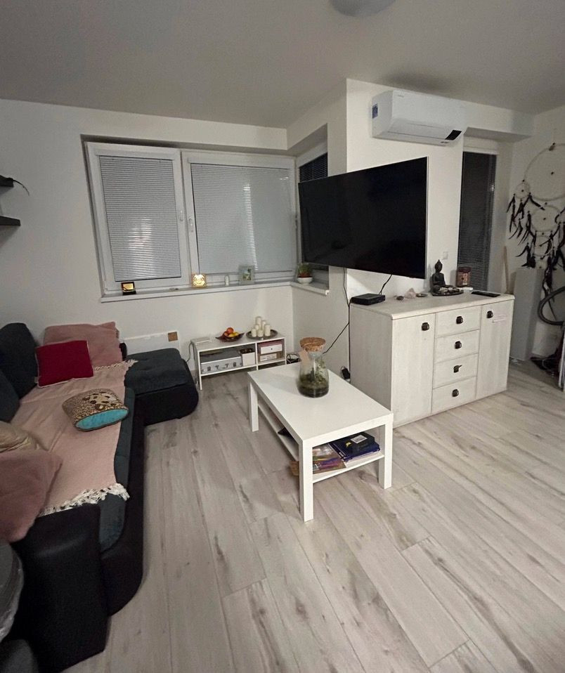 V obývačke ťa čaká pohodlná sedačka, TV, klimatizácia a vstup na balkón s príjemným výhľadom.