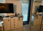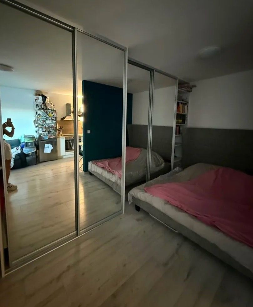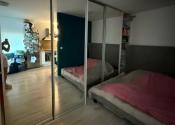Spálňová časť má veľkú rolldoor skriňu s zrkadlami a priestrannú posteľ so stolíkmi.
