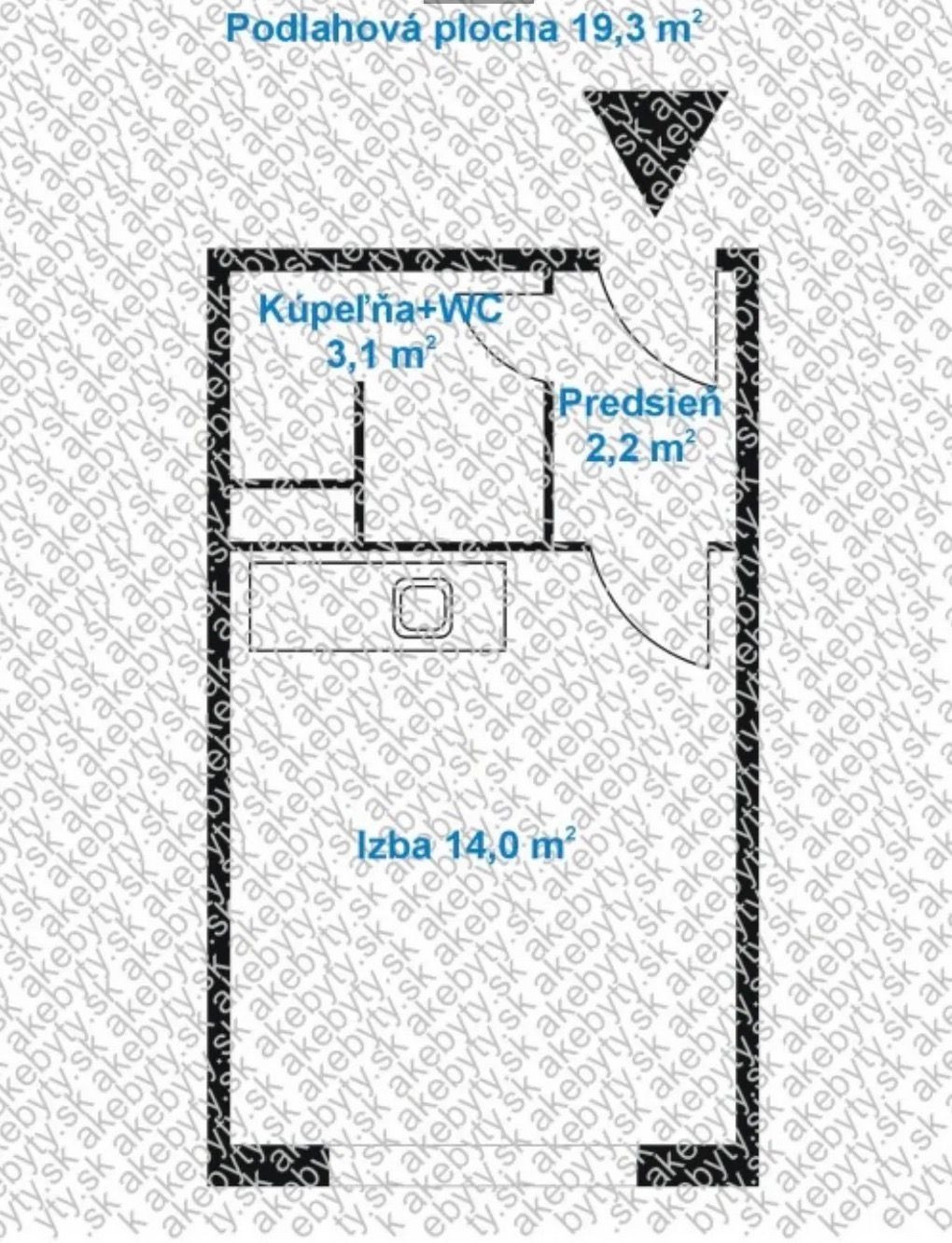 Veľkosť je 19,3 m2 a je bez balkóna.