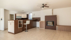 Rodinný dom: závetrie, vstupné zádverie, hala so schodiskom, kúpeľňa so sprchovým kútom a WC, jedáleň, kuchyňa prepojená s obývacou izbou, v ktorej sa nachádza kozub a priamy prístup na terasu