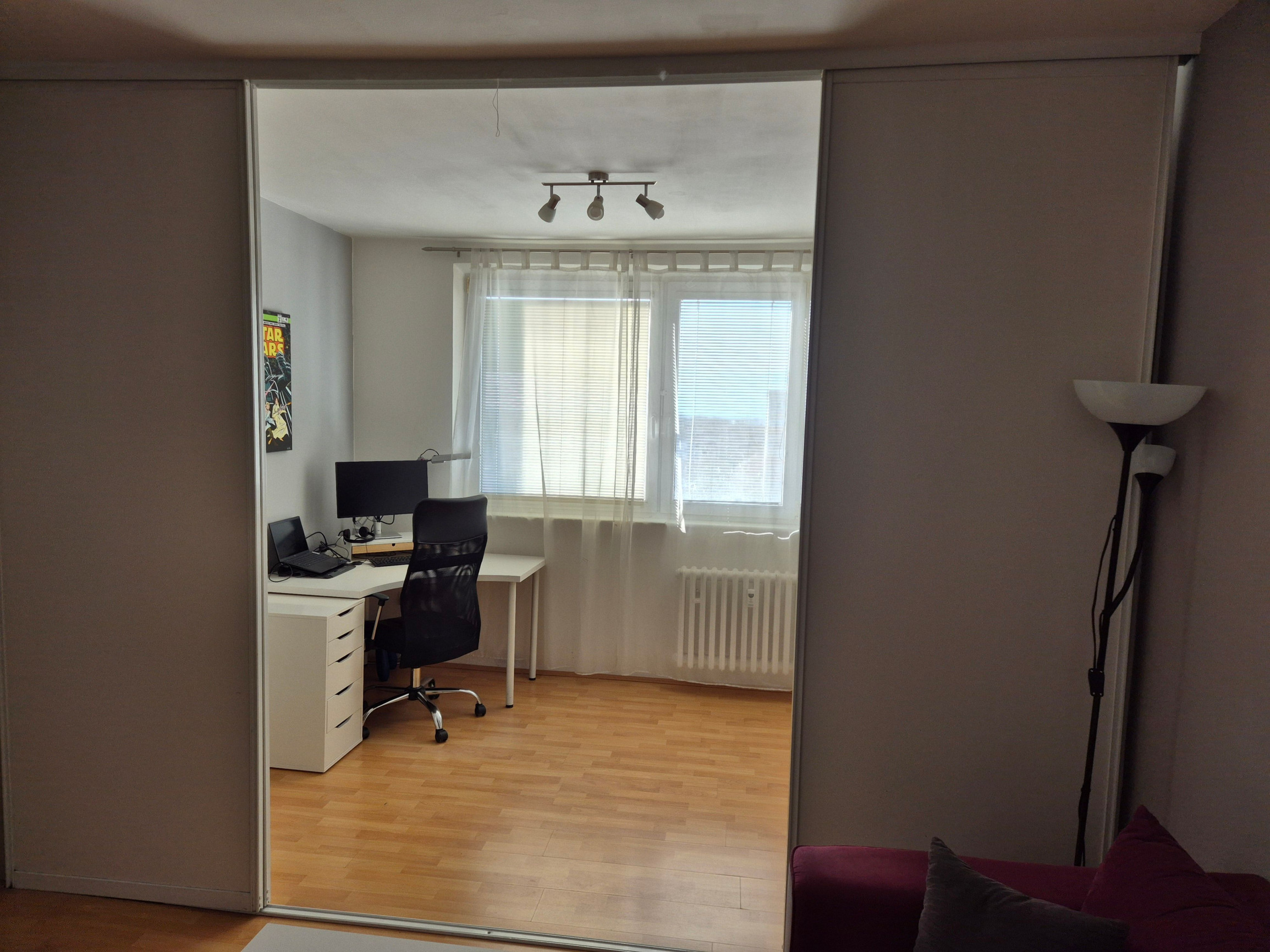 Dominantou bytu je obývacia izba, ktorá je elegantne rozdelená zasúvacím systémom na obývaciu časť a pracovňu – ideálne riešenie pre home office.