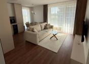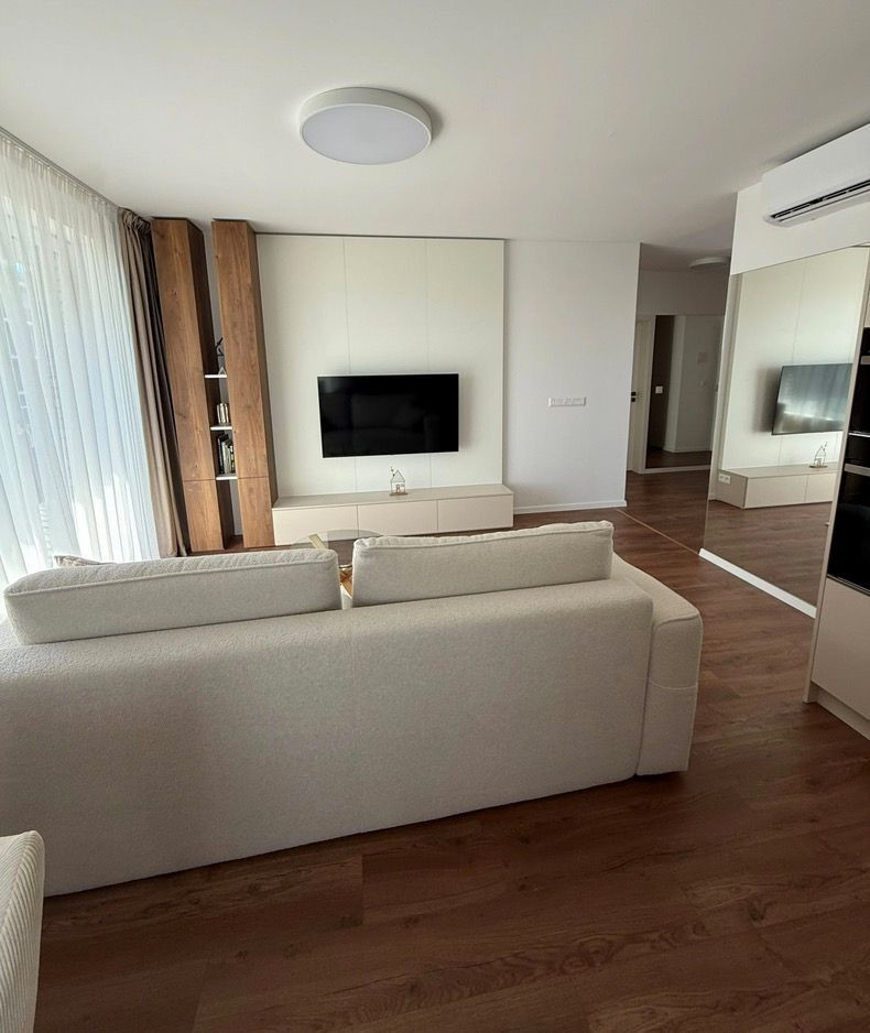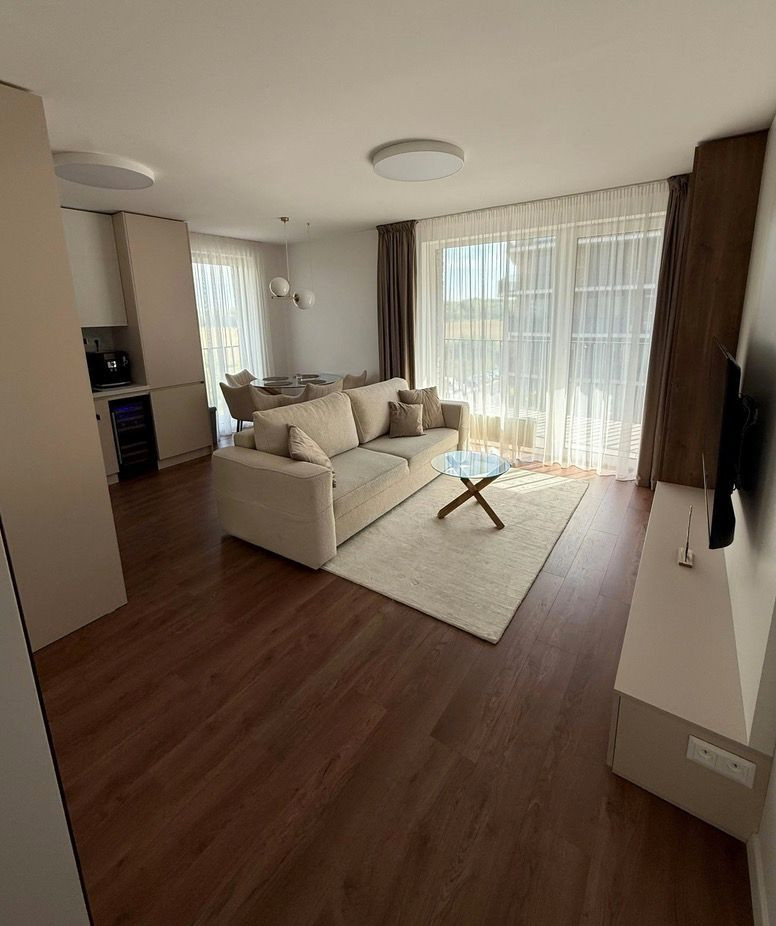 V každej z izieb – obývacej izbe, spálni aj tretej izbe – je klimatizácia pre dokonalý komfort počas horúcich dní. Na terasu je výstup priamo z kuchyne, obývacej izby, spálne aj tretej izby, čo umožňuje pohodlný prístup von z každej miestnosti.