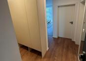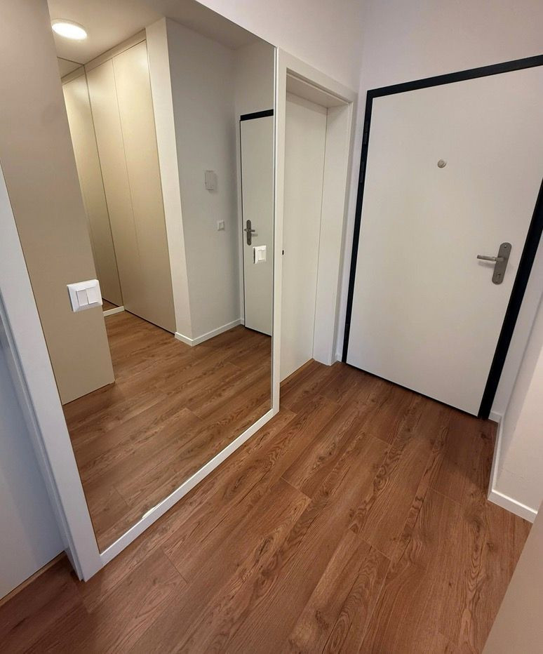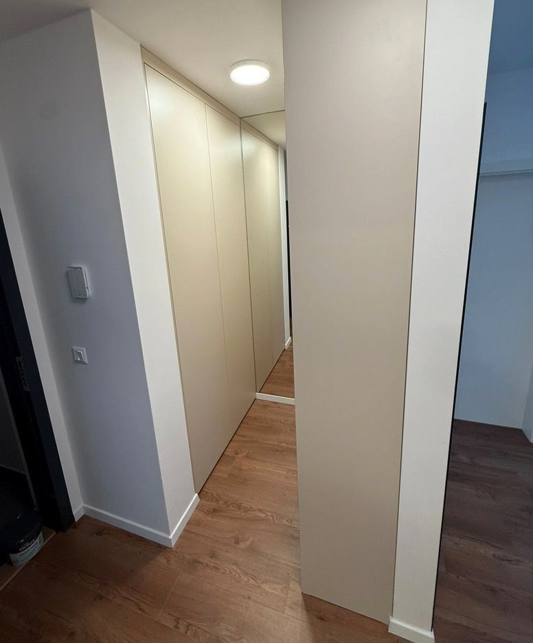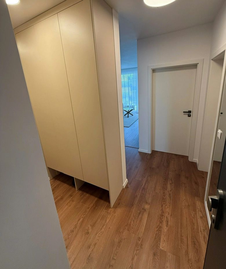 Vstupná chodba je vybavená vstavanými skriňami a zrkadlami na mieru od slovenskej firmy. Samostatné WC je pohodlne dostupné z chodby. Kúpeľňa je kompletne zariadená nábytkom na mieru vrátane práčky so sušičkou.