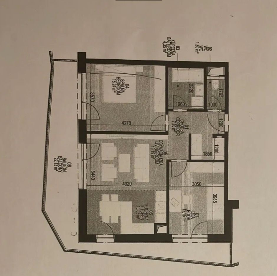 Byt pozostáva z obývacej izby s kuchyňou, spálne, izby, samostatného WC, kúpeľne s vaňou, presklenou priečkou na sprchovanie, zrkadlom, umývadlom, radiátorom, práčkou so sušičkou, chodby a veľkej terasy s výhľadom na lúku.