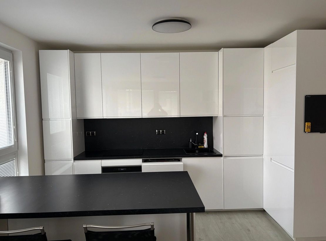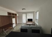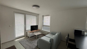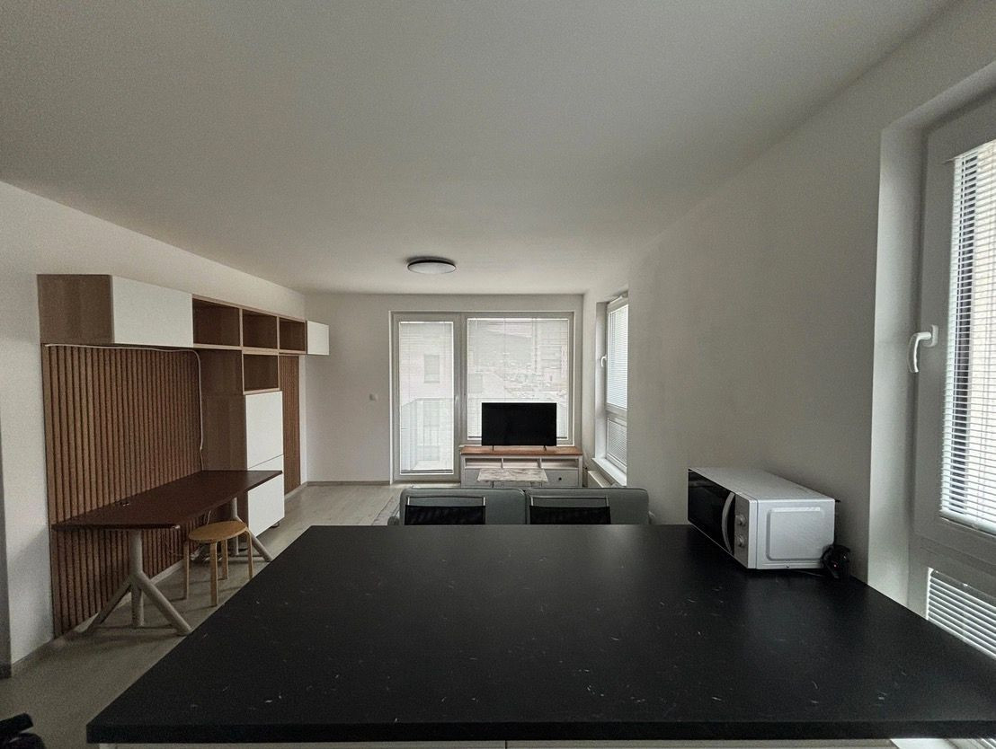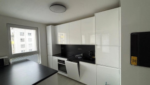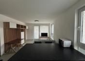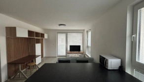 Obývacia časť je prepojená s kuchyňou. Kuchynská linka disponuje aj kuchynským ostrovom, ktorý slúži aj ako jedálenský stôl pre 2 osoby a s množstvom úložného miesta. Kuchyňa disponuje vstavanými spotrebičmi, tj. chladnička s mrazničkou, indukčná varná doska, elektrická rúra s pyrolýzou a umývačka riadu. Elektrické spotrebiče sú značky Electrolux resp. Bosch. Z obývacej izby je možnosť vstupu na balkón. V obývačke sa nachádza menší rozťahovateľný gauč, televízor, pracovný stôl a priestor na prípadný druhý pracovný stôl, či hraciu zónu.