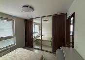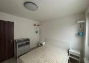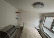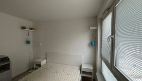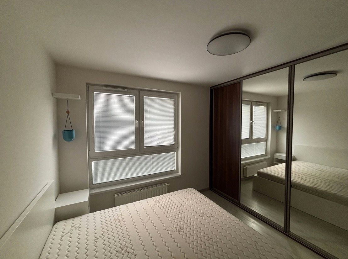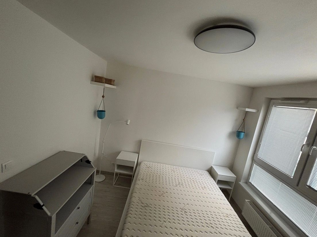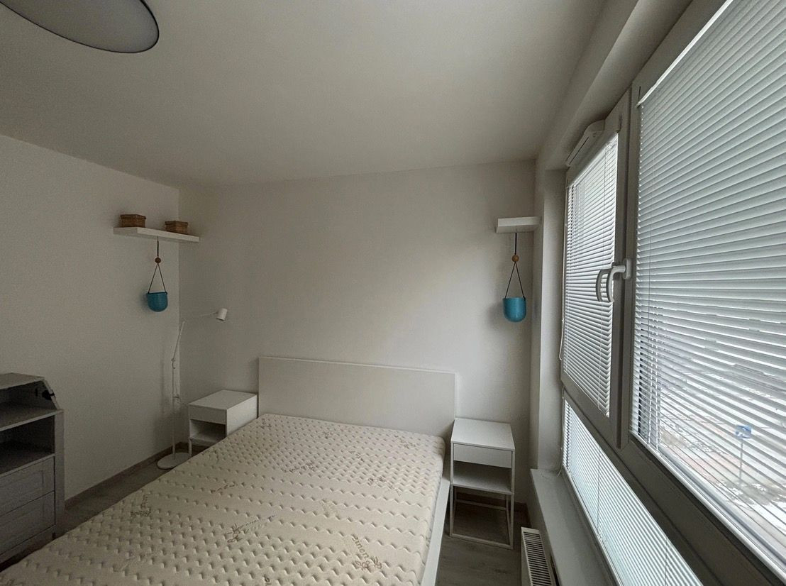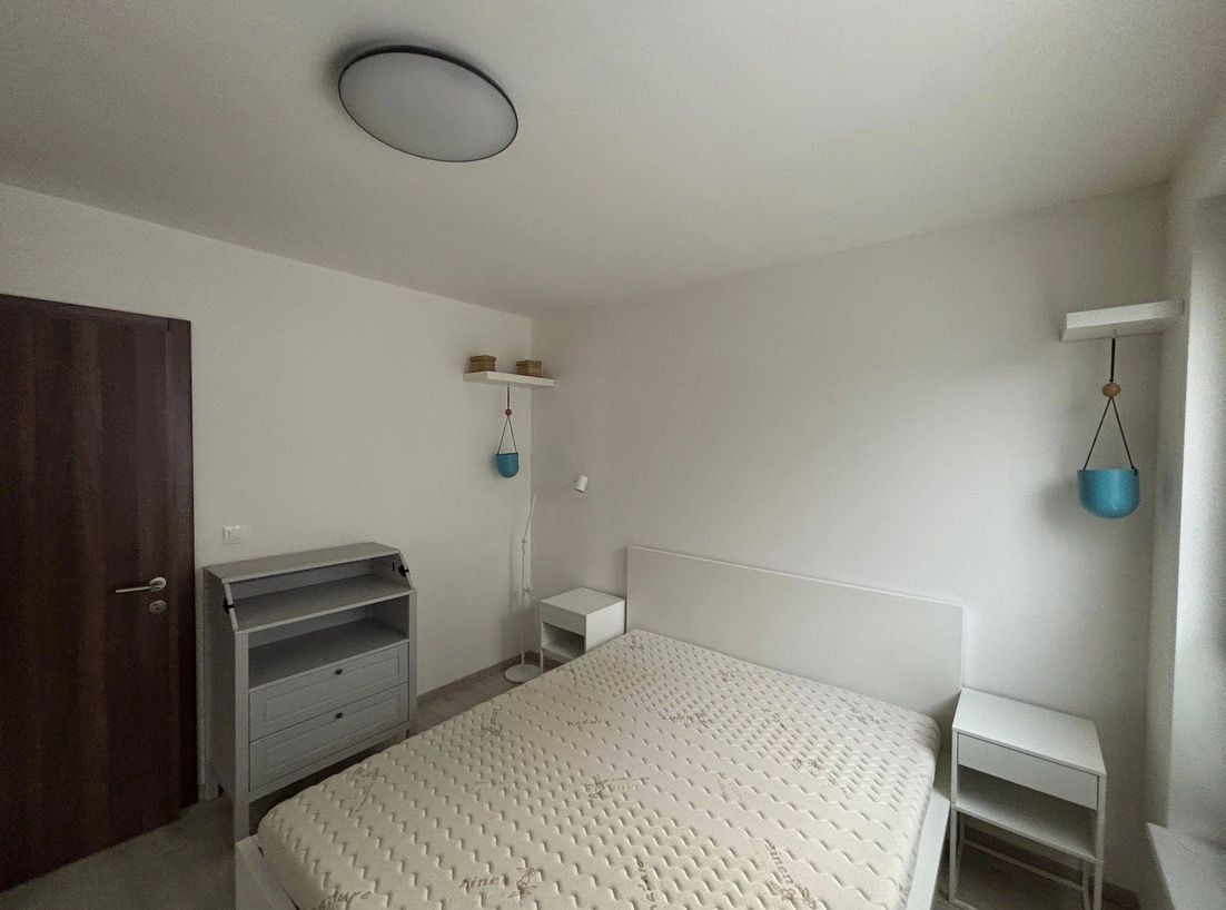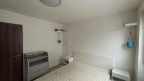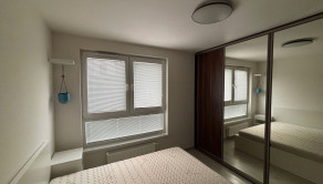Spálňa disponuje veľkým oknom, manželskou posteľou s kvalitným matracom šírky 160cm, vstavanou skriňou a menšou komodou s možnosťou prerábky na prebalovací pult.