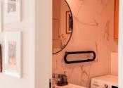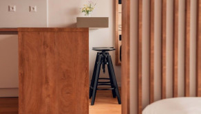 kuchyňa v tvare L so zabudovanými spotrebičmi, jedálenský pult s barovými stoličkami